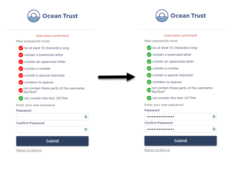 - Your new password must meet the following requirements. Please note the allowable special characters are: @ $ % & * ( ) [ ] # ^ ?. Once the requirements have been met, the red icons will turn green: