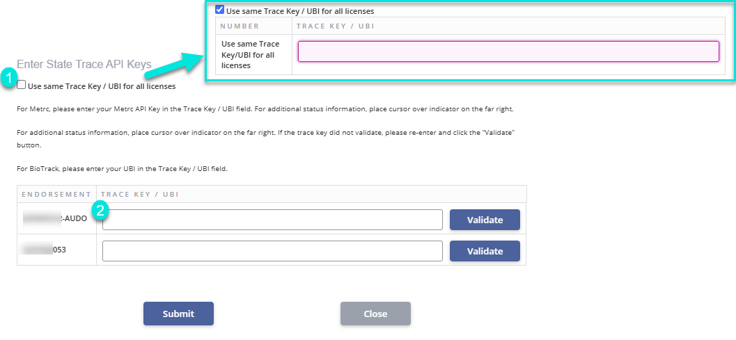 - Once the API key is displayed, the user will copy and paste into Shield Compliance Portal when prompted for their API Key. If the key is from the Metrc admin, the user should be able to use the same Trace API key for all licenses (see gold steps below). If not, enter each trace key for its respective license (see green arrow below).